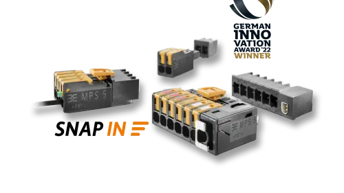 SNAP IN offers the possibility to connect flexible and fine-stranded conductors without crimped-on ferrules quickly and easily without tools. The stripped conductor is simply inserted into the clamping point until the spring mechanism releases with a clearly audible click. This creates a vibration-proof, gas-tight, and permanently reliable connection. A coloured pusher allows visual inspection of the connection. If it is actuated, the clamping point is released immediately and the spring is pretensioned for rewiring. A standard screwdriver is all that's needed. The innovative SNAP IN technology was awarded the "German Innovation Award 2022" last autumn.