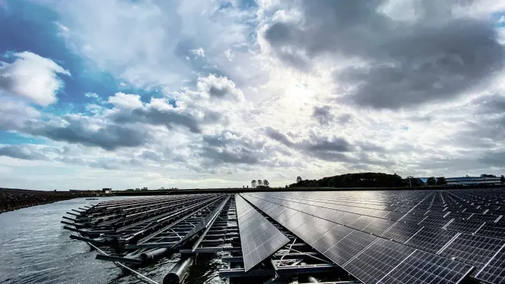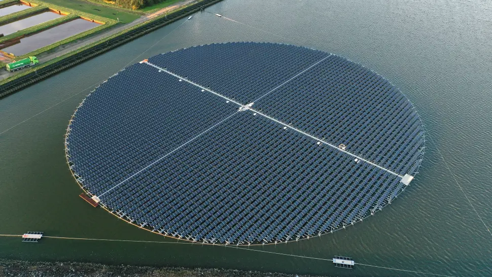 The company Floating Solar BV, based in the Netherlands, specialises in floating solar power systems. They have established three artificial islands for the largest floating, dynamic solar park in Europe. The plan is to extend this to 15 islands. The solar park will soon contain 67,000 solar panels which will be divided across 15 round islands, each 140 meters in diameter. These panels float in a basin where water is stored for later use. Together, they will have a capacity of over 22 MW peak.